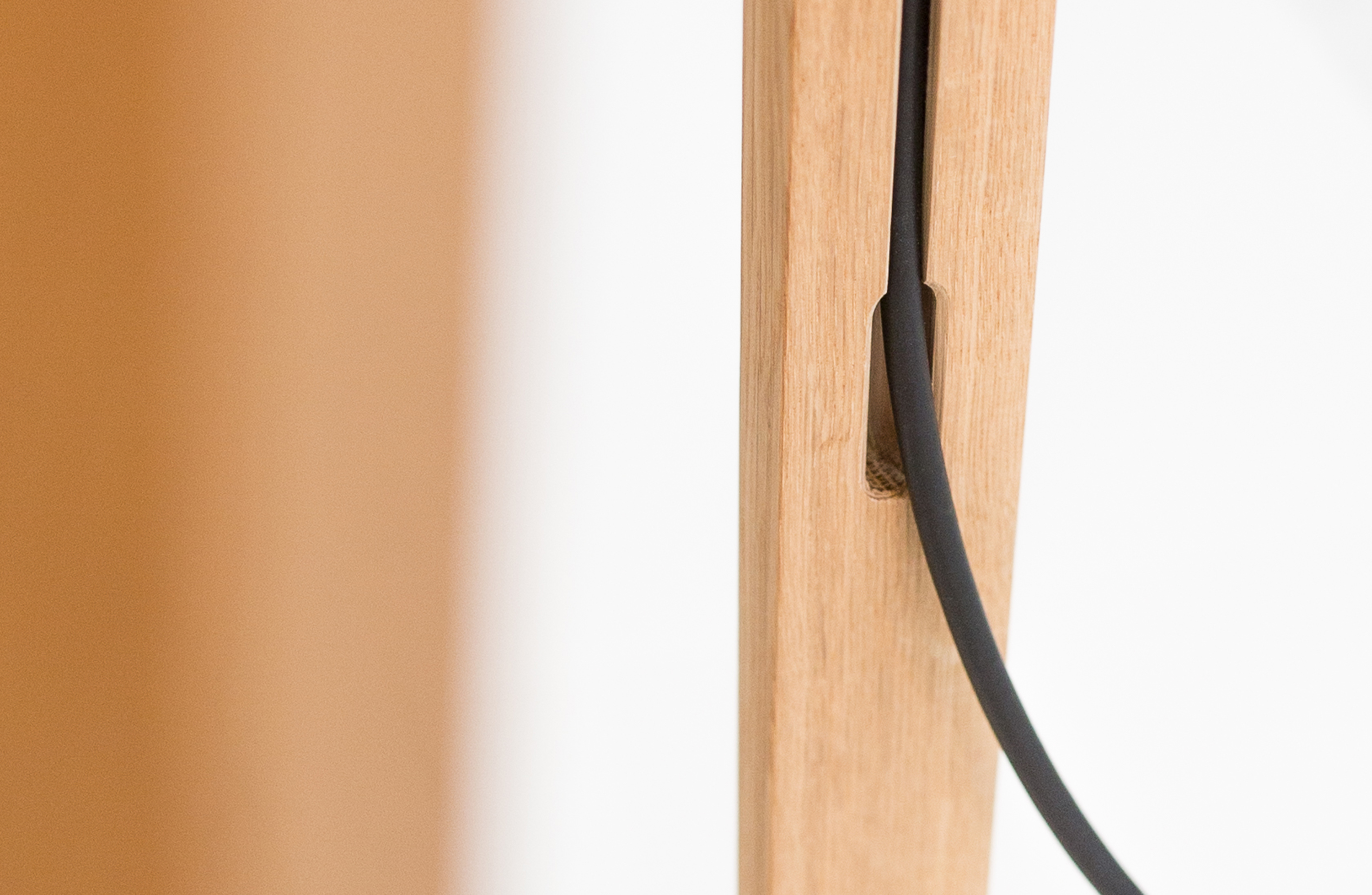Die Leuchte besteht aus einem massiven Holzgestell und einem textilen